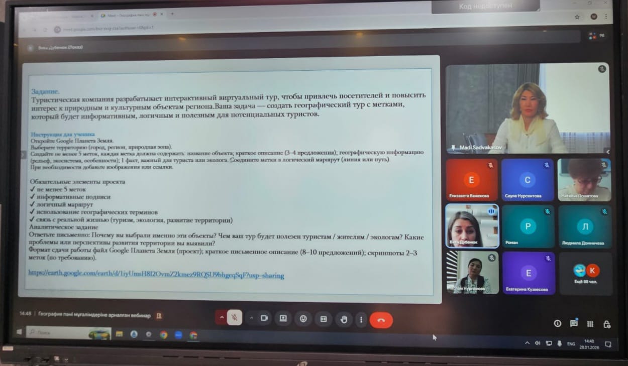 Вебинар белсенді кәсіби диалог форматында өтті: қатысушылар педагогикалық тәжірибелерімен бөлісті, жаңашыл әдістерін талқылады, практикалық мысалдарды қарастырды және тәжірибеге бағытталған сұрақтар қойды. Мұндай формат мұғалімдердің кәсіби құзыреттілігін арттыруға және география мұғалімдерінің әдістемелік құралдарын кеңейтуге ықпал етеді.